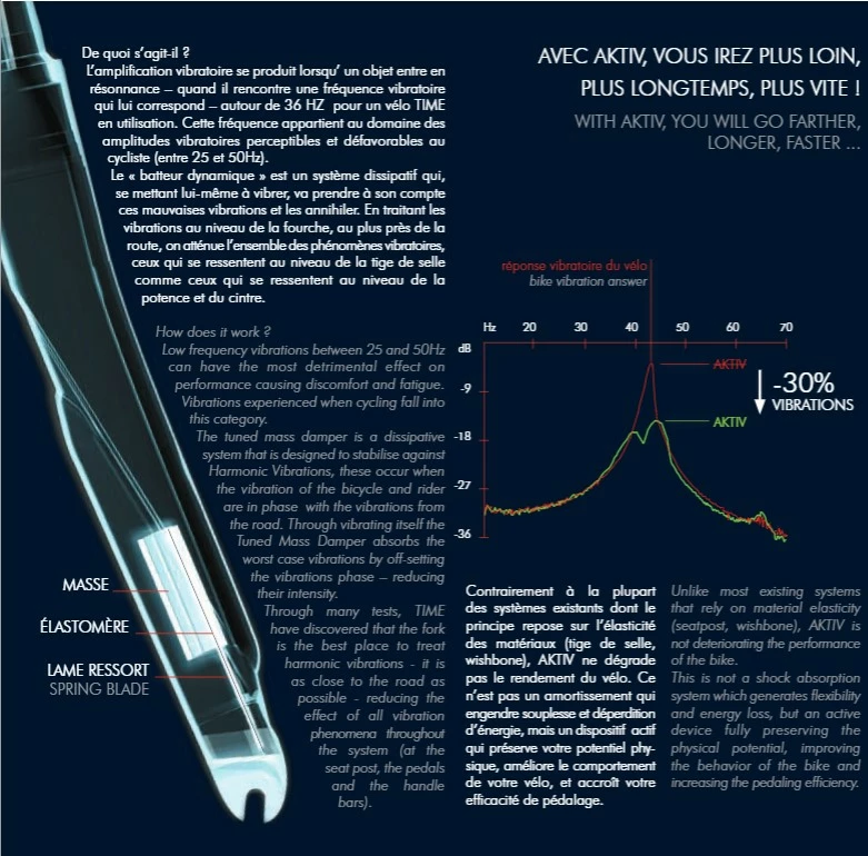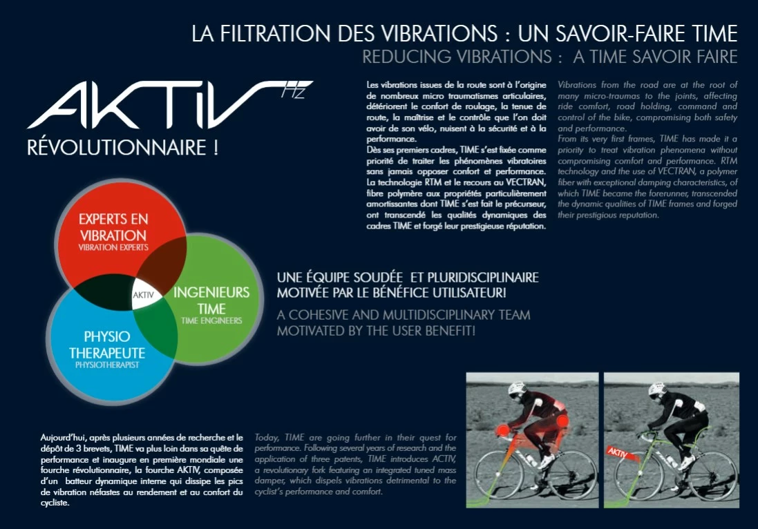 En ce qui concerne la rigidité, les relances en sortie de virage ou autres, l’Alpe d’Huez est certes moins typé que le Scylon, mais il est 25% plus rigide que l’Izon. Pour développer le côté nerveux du vélo, Time a augmenté le volume de fibres haut module, couplées à un boîtier de pédalier BB386 et une tige de selle Direct link, en forme de D, pour un meilleur transfert d’énergie. Nerveux en montée et précis en descente. L’utilisation de fibres Vectran sur certaines parties du cadre a un effet d’absorption des effets négatifs qui rend le vélo non seulement plus performant, mais aussi plus confortable et efficace au pédalage.